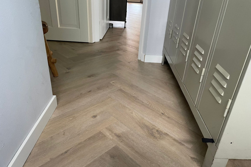 De twee lieten het idee van een visgraatvloer met eikenhoutdesign een aantal weken op zich inwerken. En besloten er toen voor te gaan! Een appje en een bezoek aan de Vloerenfabriek.nl later was de afspraak voor het leggen van hun nieuwe vloer gemaakt. Op woensdag kochten ze deze, maandag egaliseerden wij de ondervloer en dinsdag lag de PVC-vloer erin!